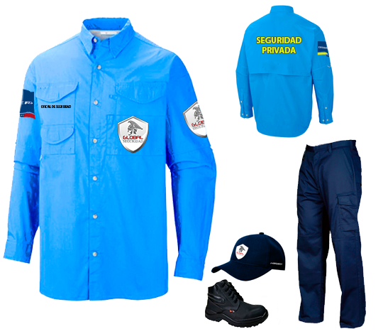 Camisa manga larga en color azul claro, identificada en la parte frontal derecha con el logo de nuestra institución, y en el frontal izquierdo identificado como OFICIAL DE SEGURIDAD. En la Espalda la identificacion SEGURIDAD PRIVADA